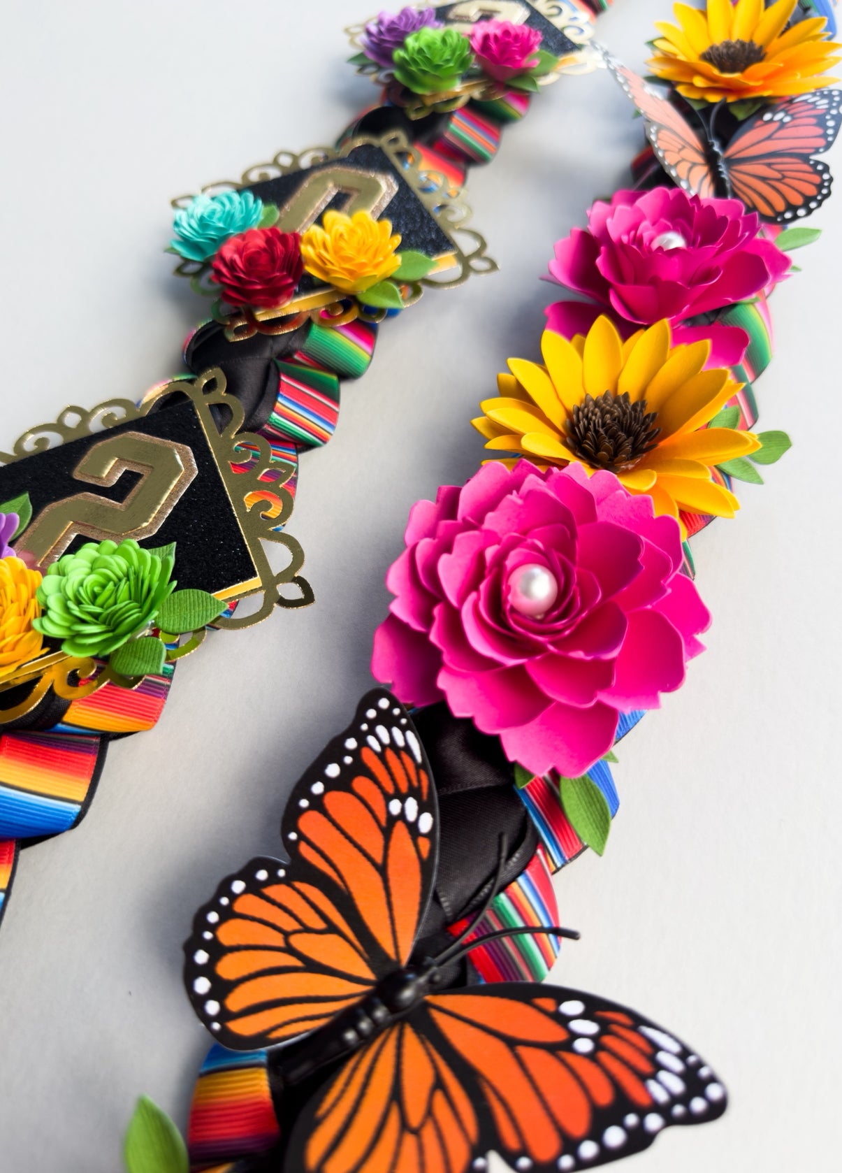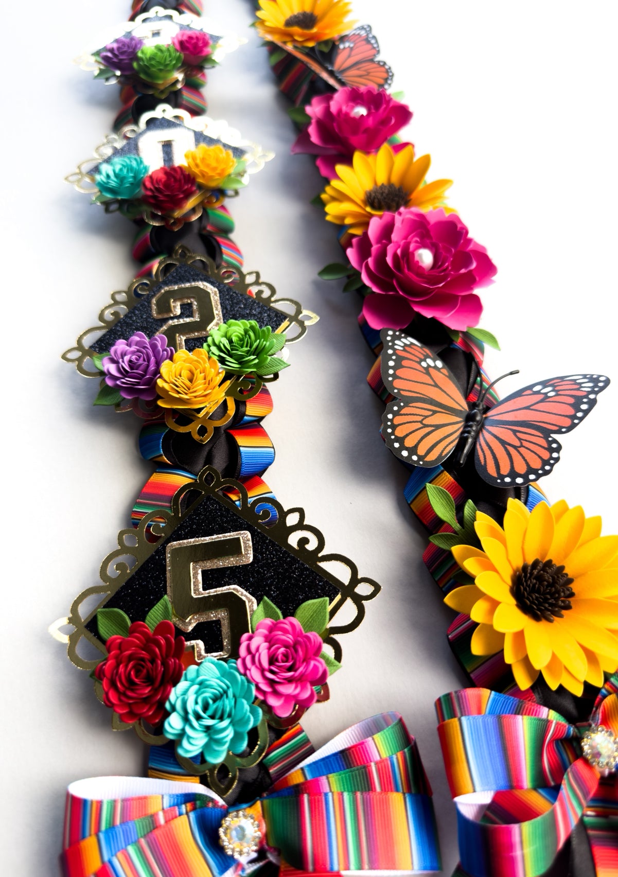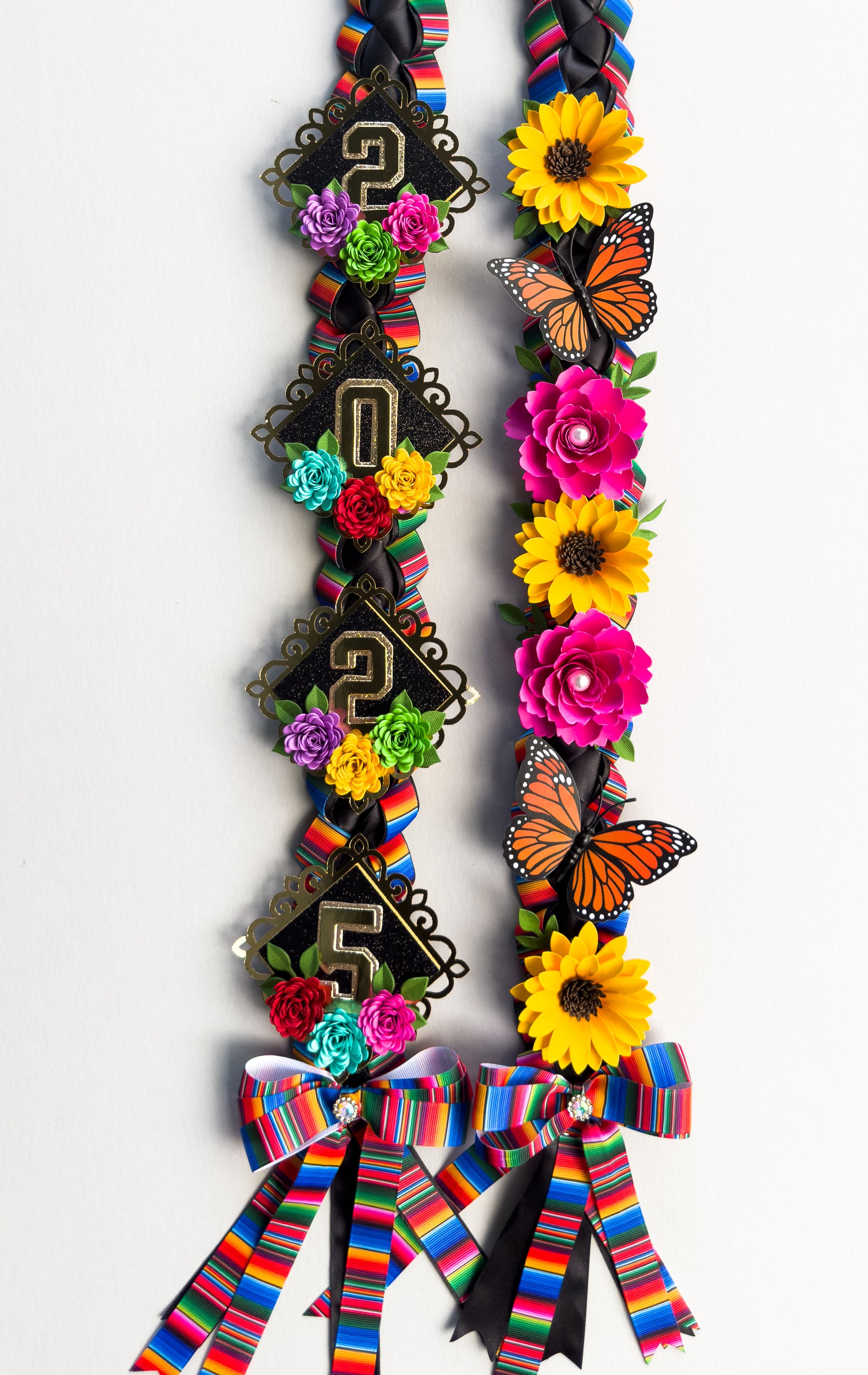 This handcrafted ribbon lei measures approximately 60" and is made with a mix of black satin and grosgrain ribbon combined with bright sarape colors. Adorned with colorful handmade flowers and the graduation year of your choice (2025 or 2026), it carries the essence of Mexican pride and artistry. Inspired by the bold beauty of Frida Kahlo, this lei is a meaningful keepsake that honors tradition while celebrating your graduate’s big achievement.