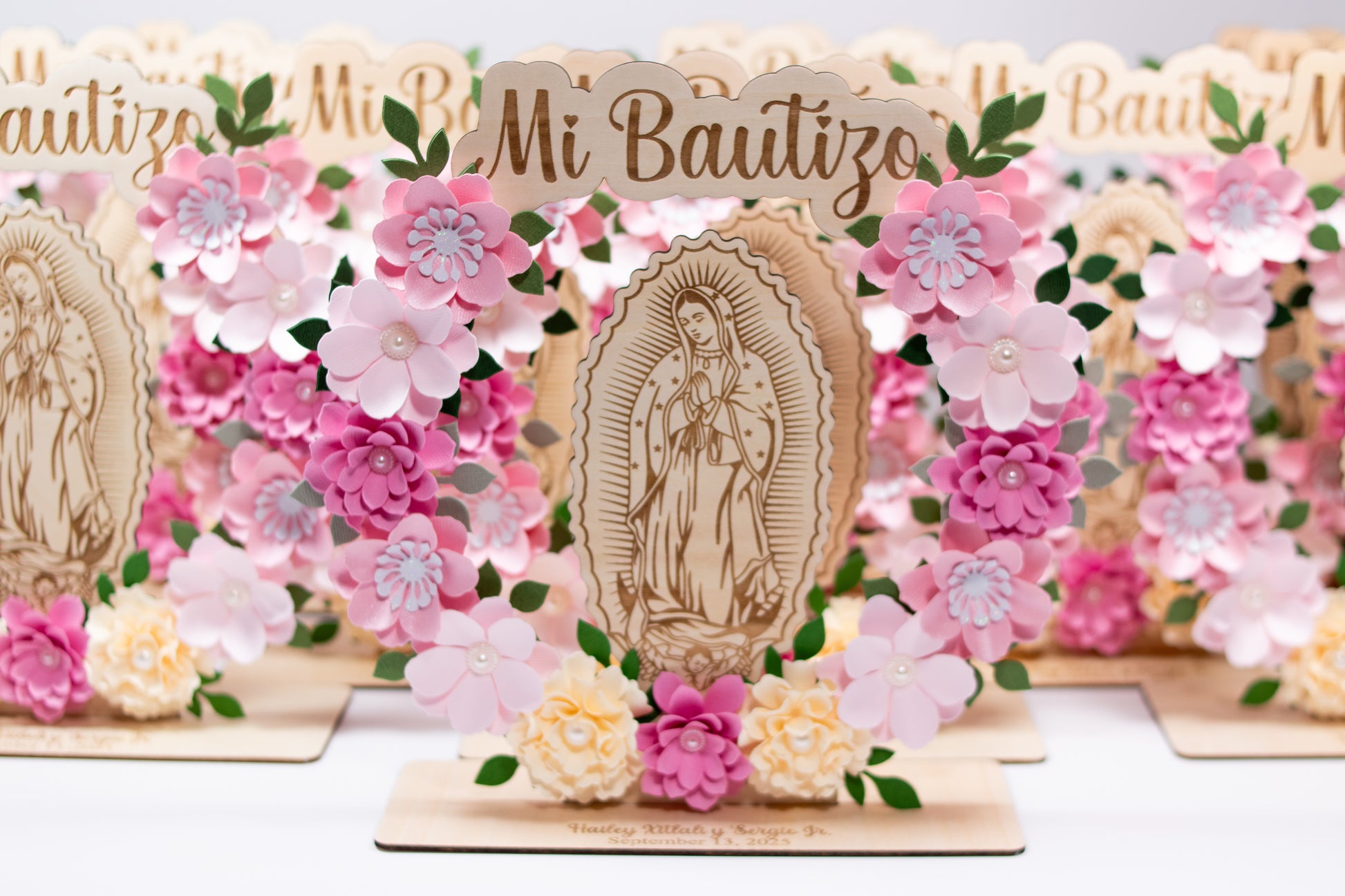 Centros de mesa elegantes en madera contrachapada de 3 mm (9.75” x 8.75”), decorados con cartulina de 65 lb en el color de tu elección. Personalizables con hasta dos líneas grabadas (nombre y fecha) y flores en el color que prefieras.