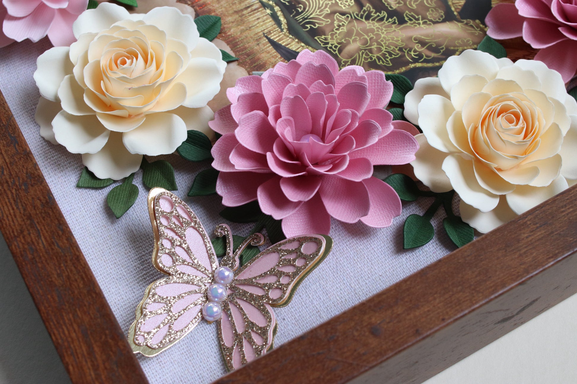 Each piece is carefully decorated with handcrafted paper flowers, delicate pearls, and butterflies, all arranged with precision and care to create a stunning dimensional effect. Subtle gold accents highlight the sacred image of the Virgen, adding an elegant, timeless glow.
