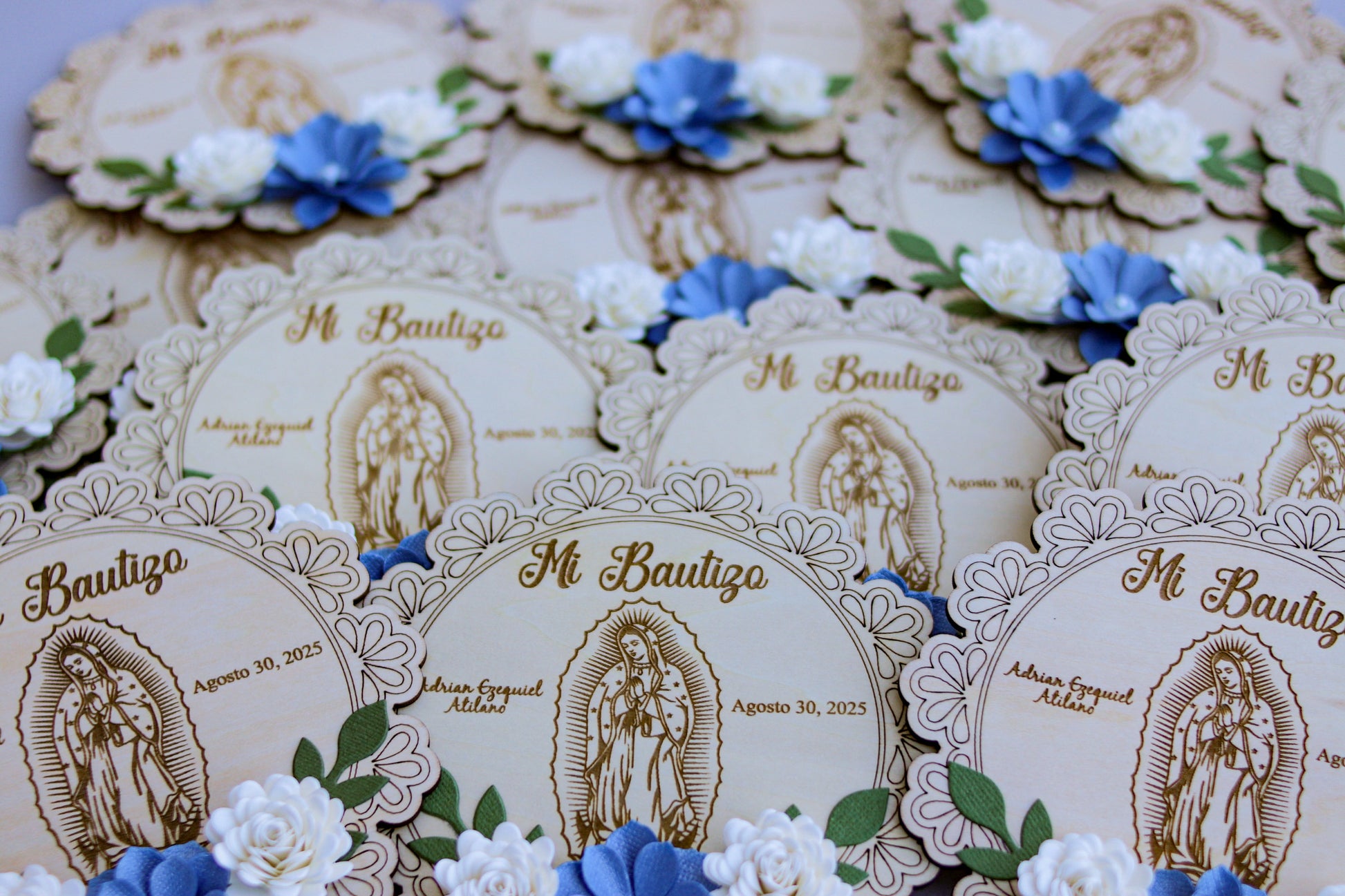 Beautifully handcrafted wooden baptism keepsakes, featuring an engraved image of San Judas or the Virgen de Guadalupe. Each piece is decorated with delicate paper flowers in the color of your choice, adding a personalized and elegant touch to every design.
